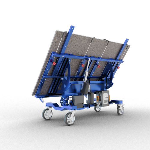 Carro profesional motorizado diseñado para transportar, elevar e instalar losas de gran formato con total seguridad y precisión. Su sistema de baterías recargables y control remoto permite trabajar con comodidad en talleres y zonas de montaje, reduciendo el esfuerzo físico y mejorando la productividad.