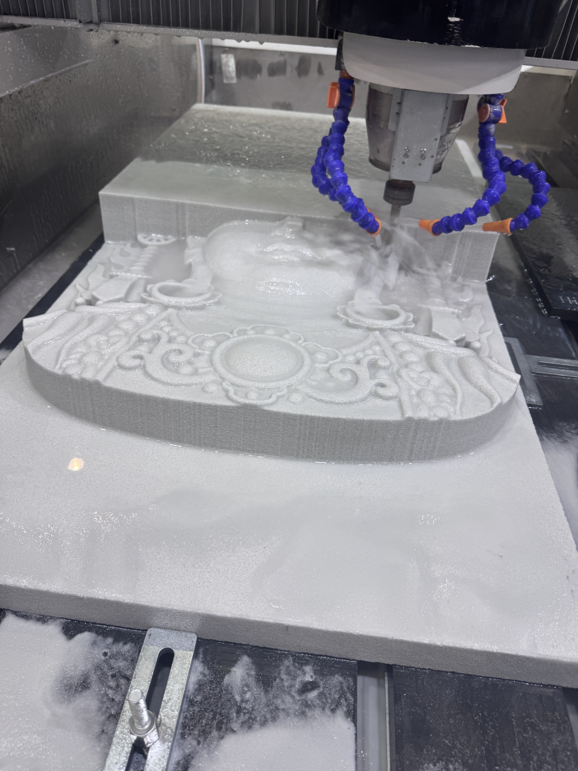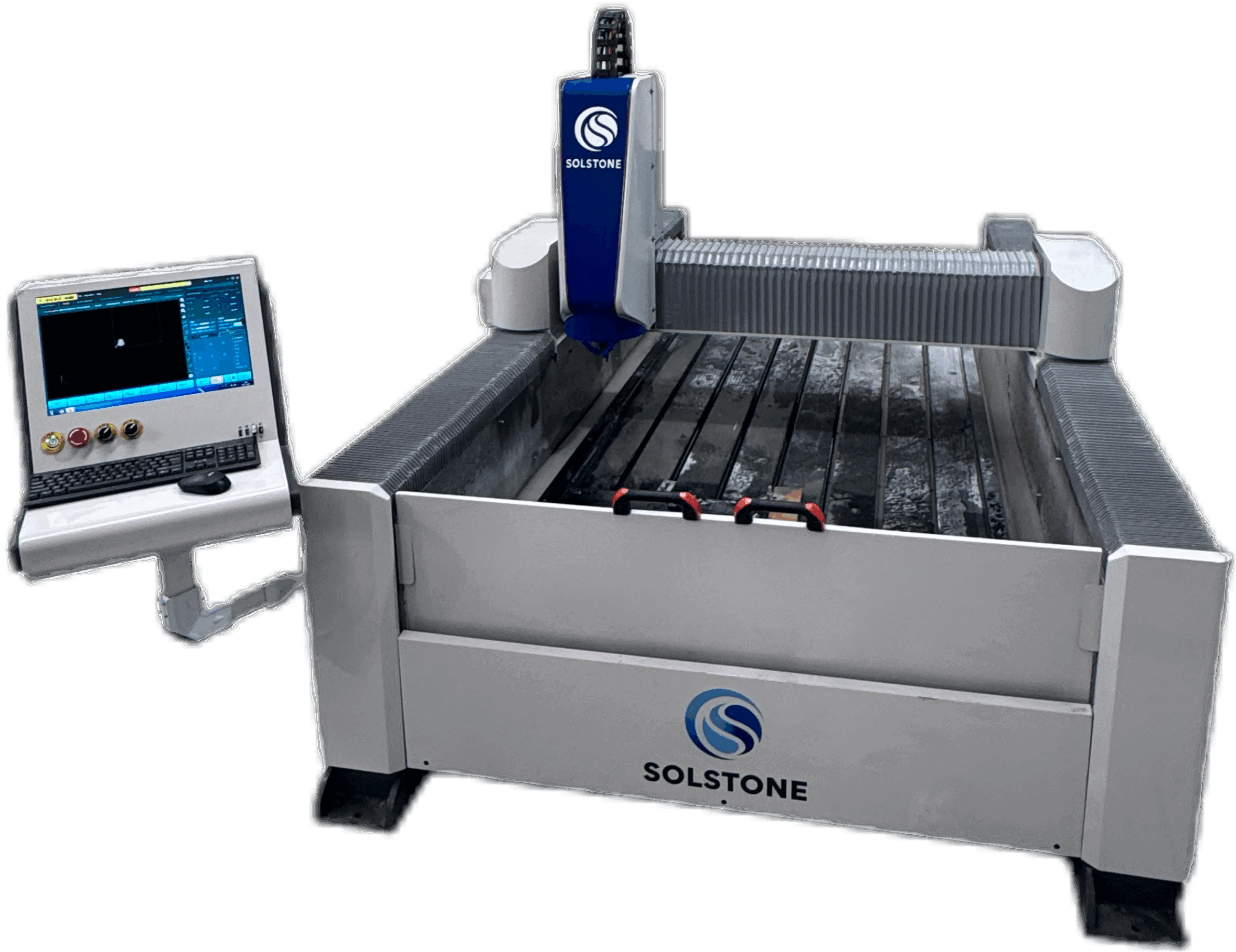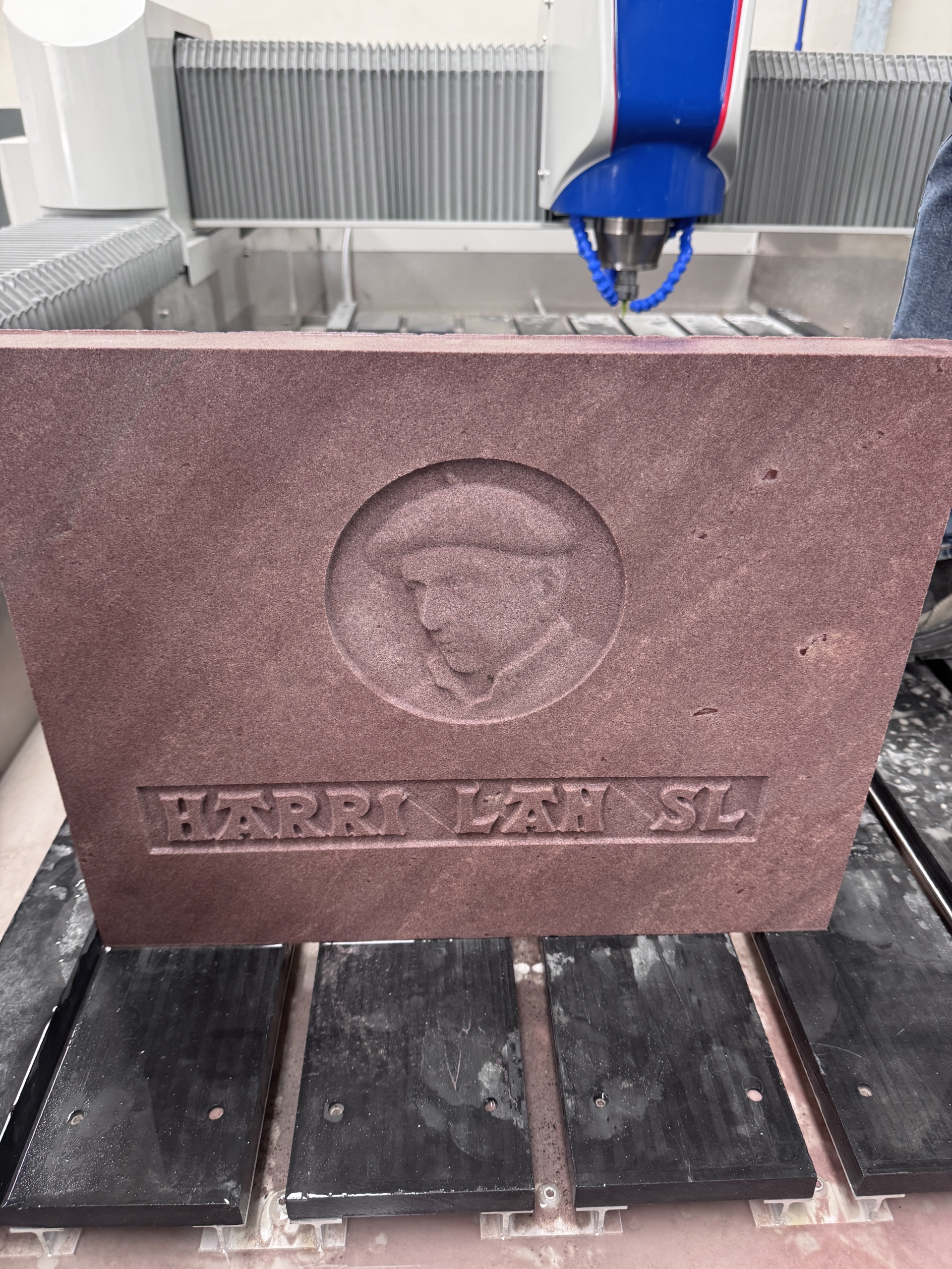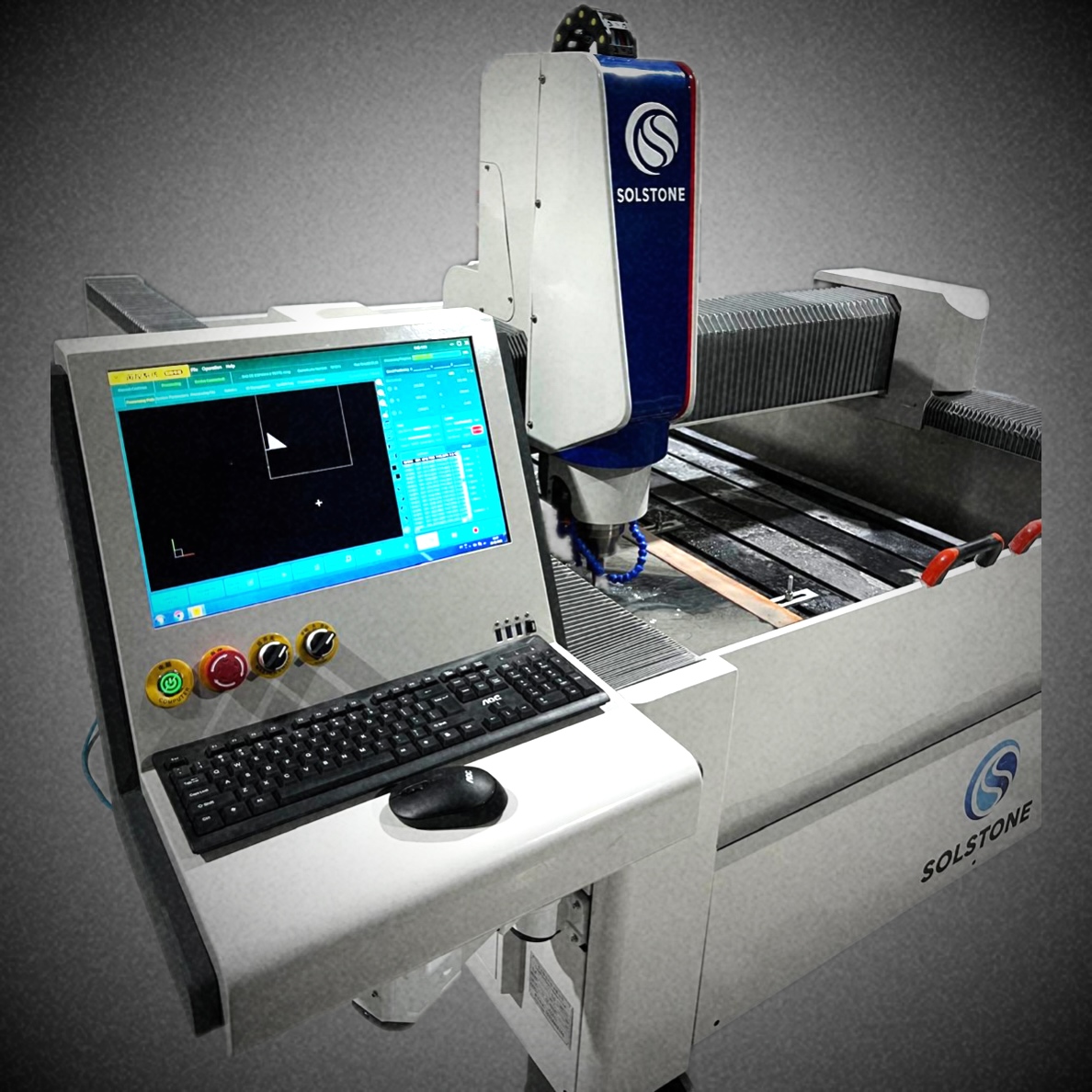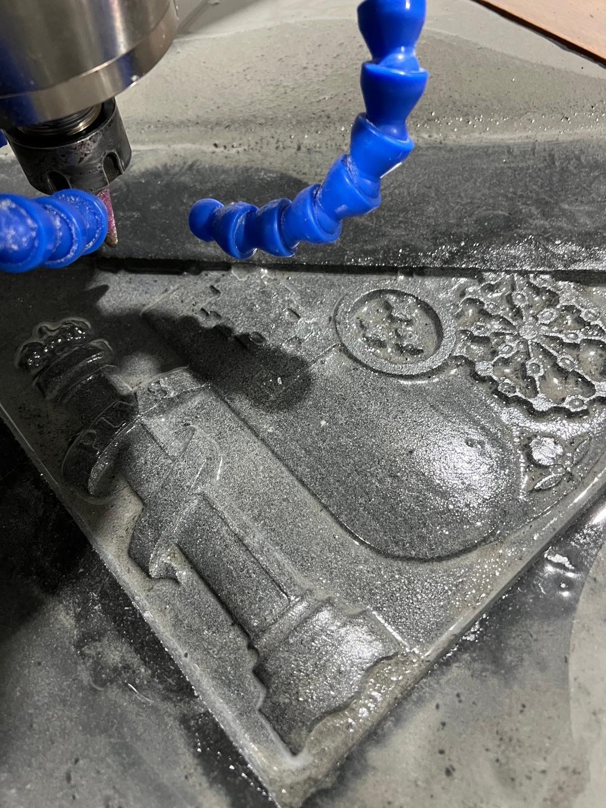 Fresadora CNC de 3 ejes interpolados, diseñada para grabado en relieve, inscripciones, desbaste y texturizado en superficies pétreas.