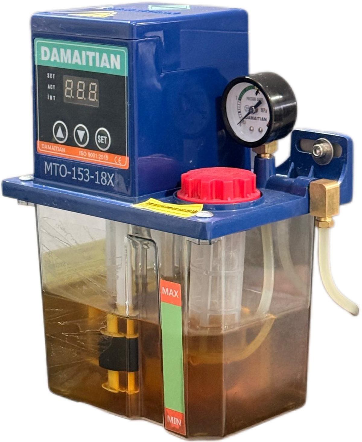El equipo incorpora un sistema de lubricación automática que abastece de forma continua a todos los componentes mecánicos, garantizando un funcionamiento suave, reduciendo el desgaste por fricción y prolongando la vida útil de la máquina.