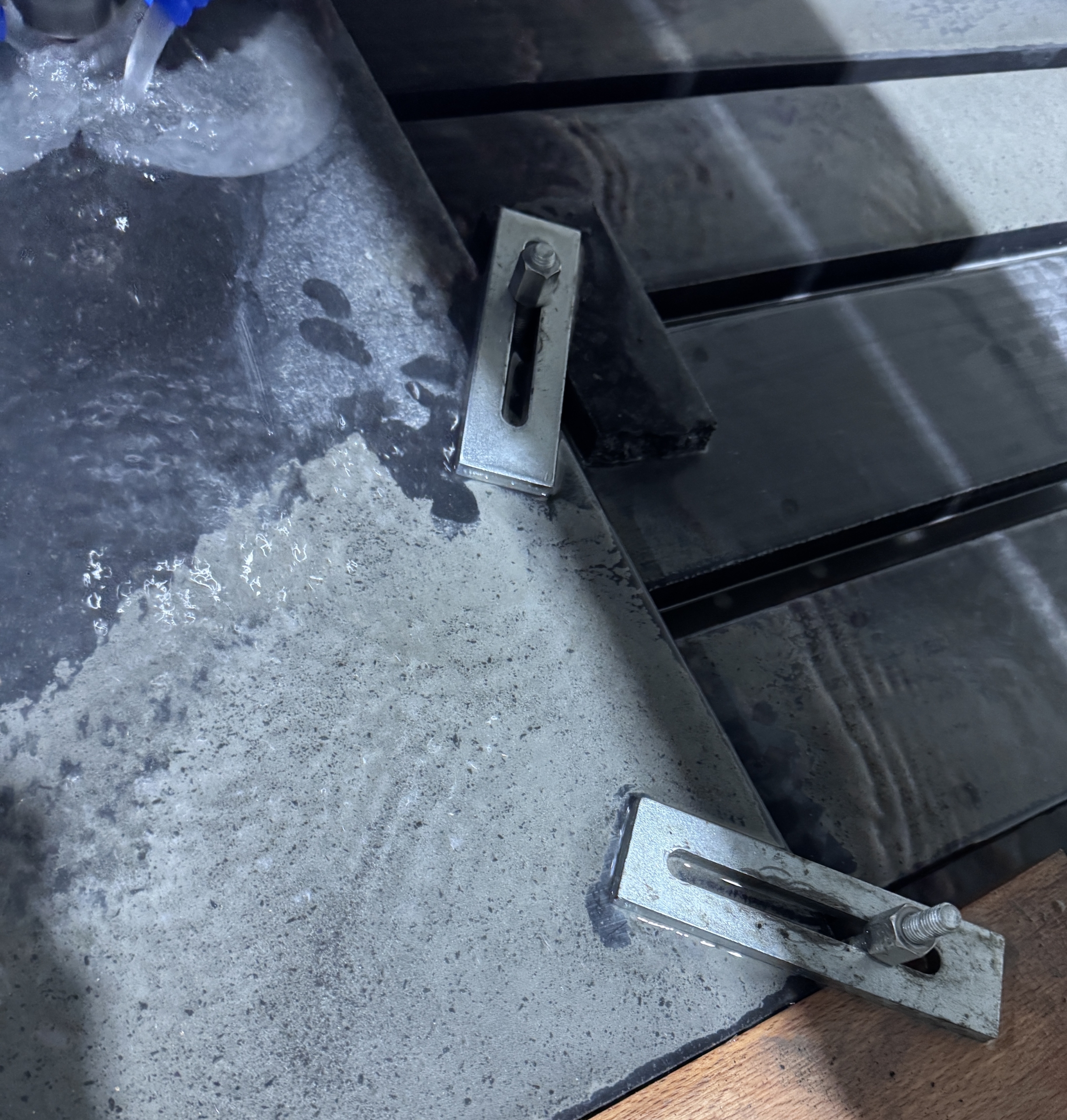 El agua se almacena en dos depósitos situados en la parte posterior de la mesa de trabajo, desde donde una bomba de presión la impulsa hacia el cabezal de la máquina para su distribución uniforme sobre la herramienta.