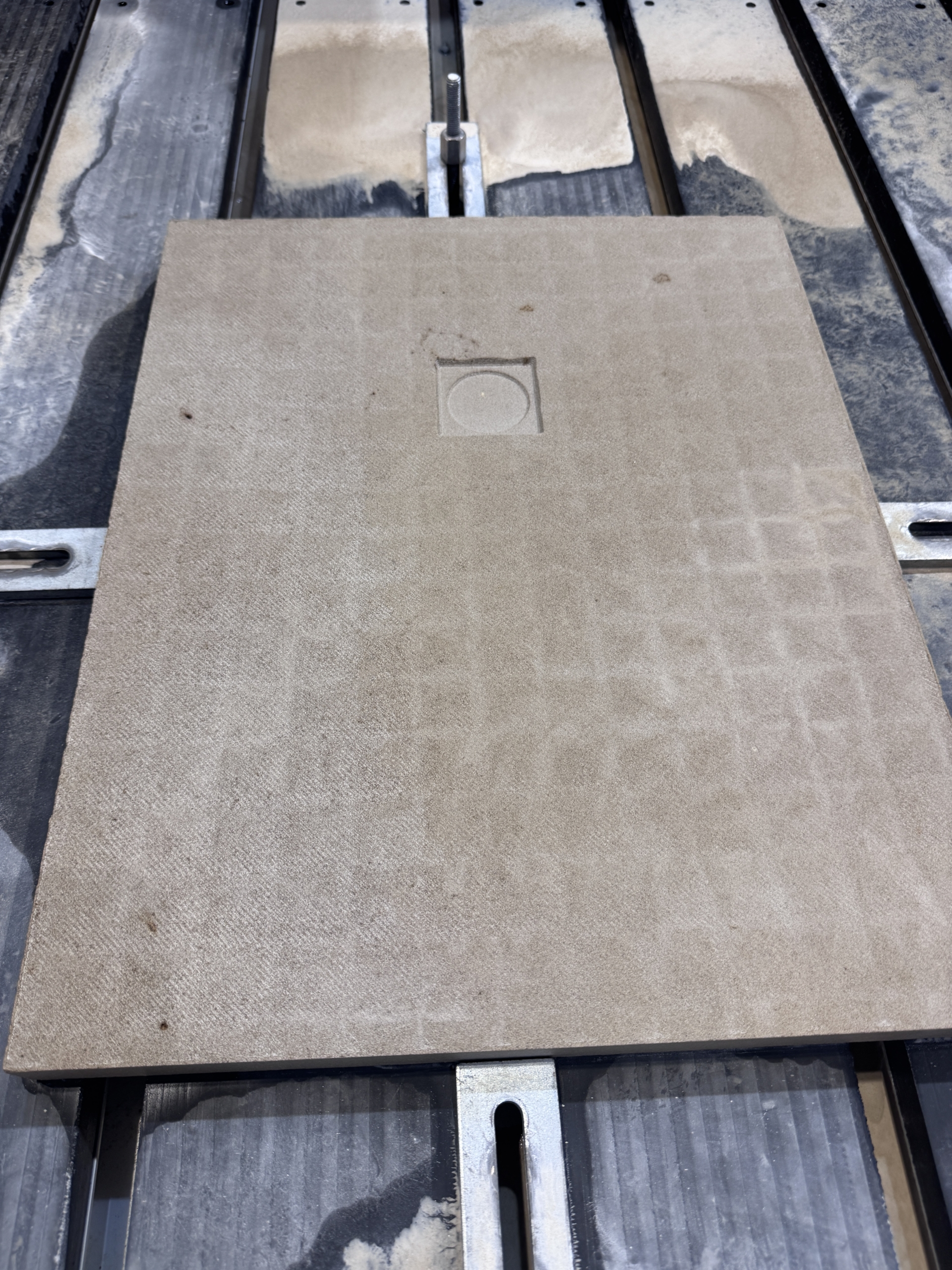 La mesa de trabajo está construida con láminas de alta resistencia, dispuestas de forma separada para facilitar la fijación de los sistemas mecánicos de sujeción de la piedra durante el procesado.