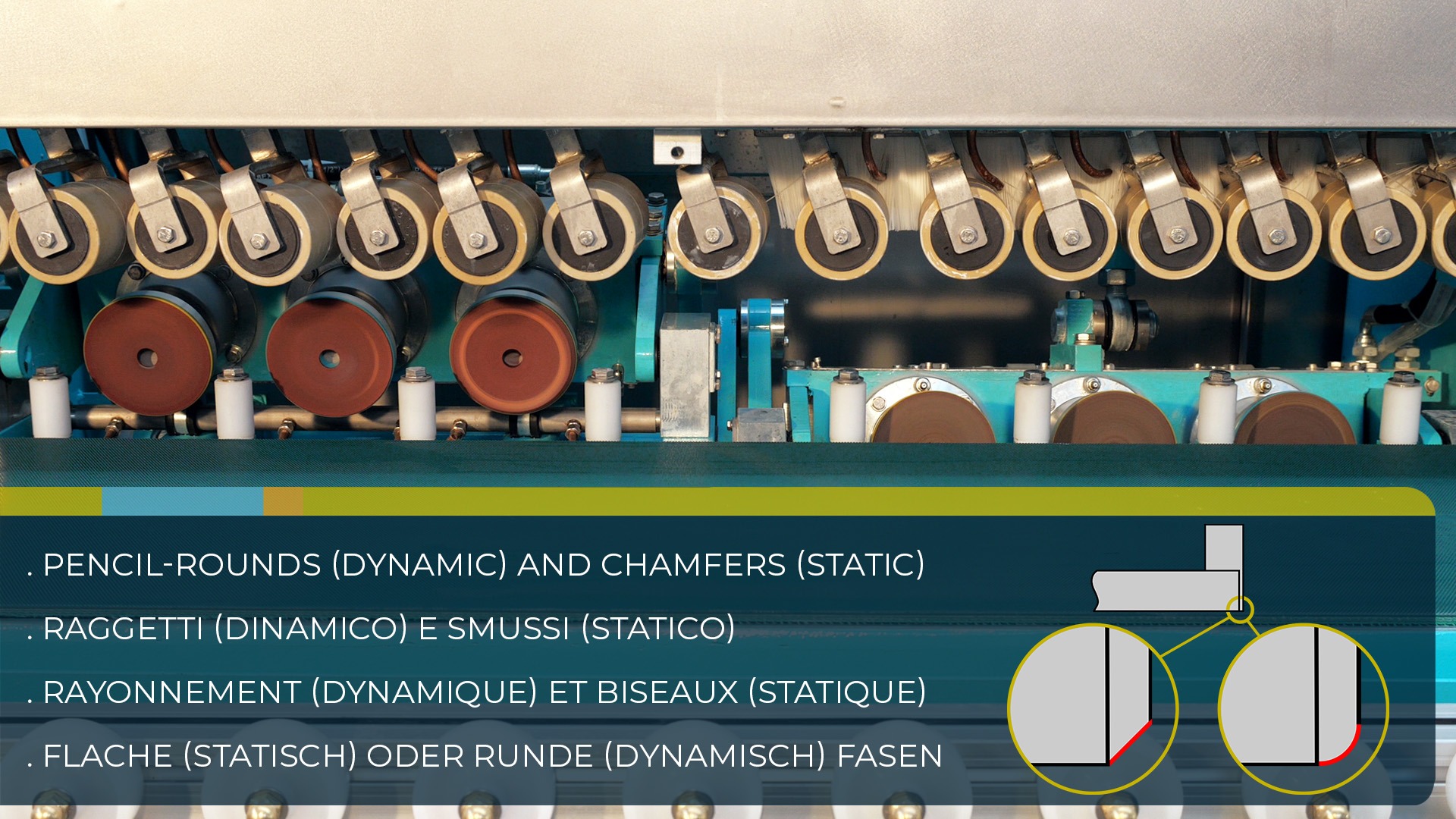 Producción continua: las piezas entran en línea y salen completamente pulidas y biseladas.
