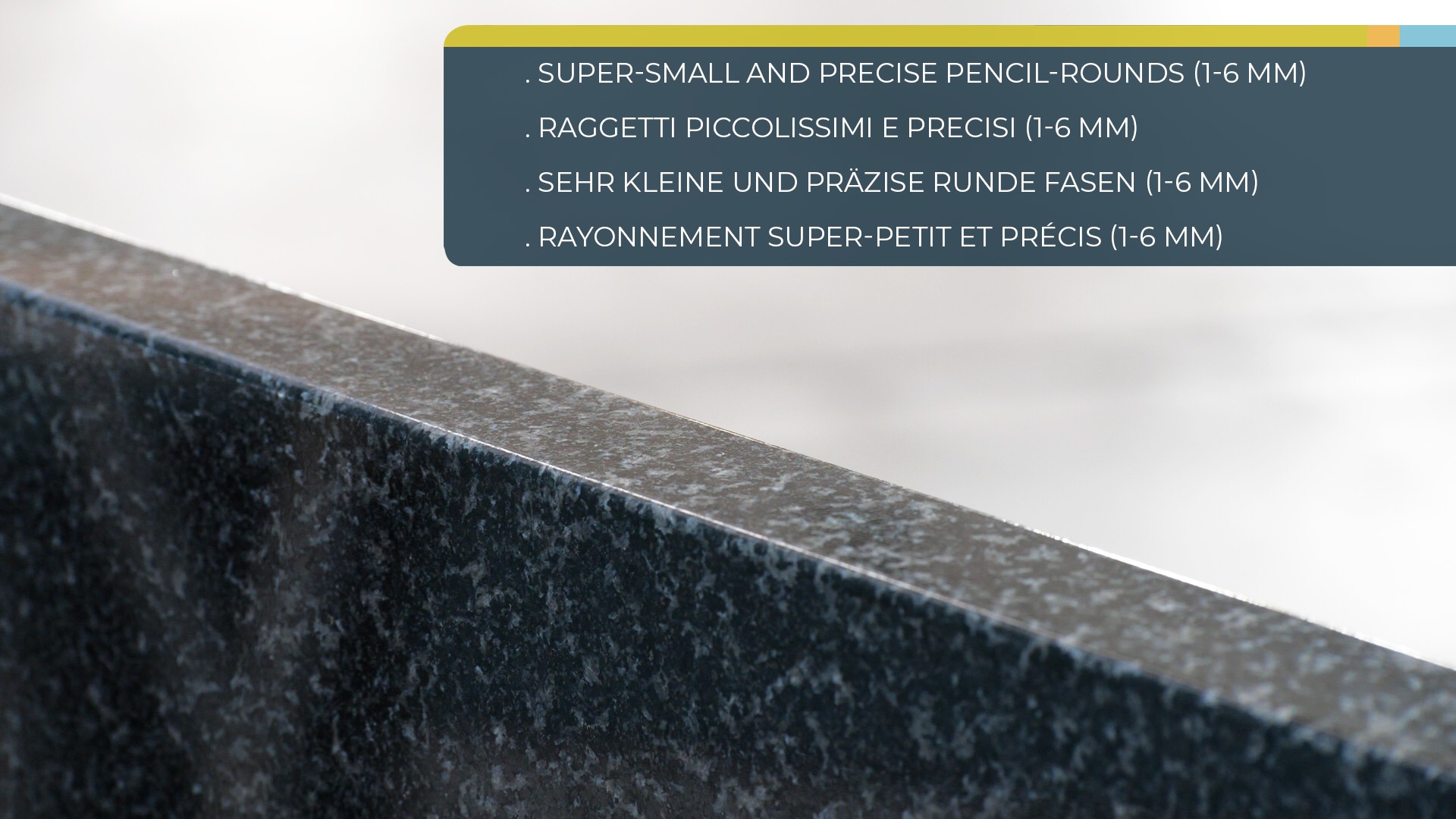 - Redondeos finos en aristas tipo lápiz (hasta 40 mm de espesor)