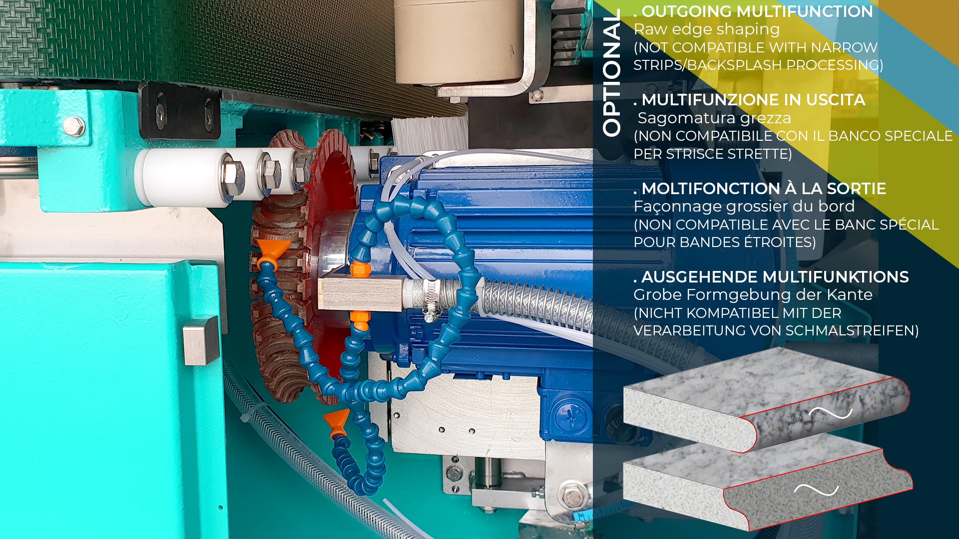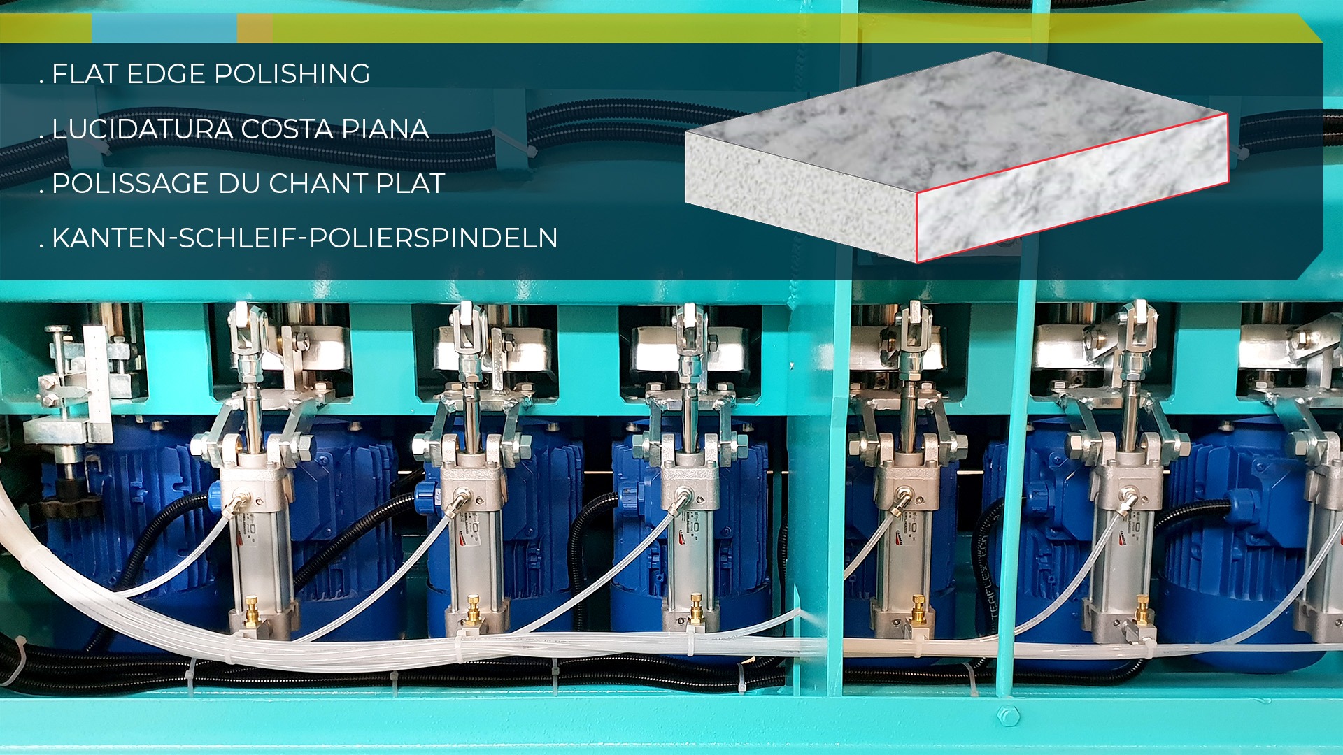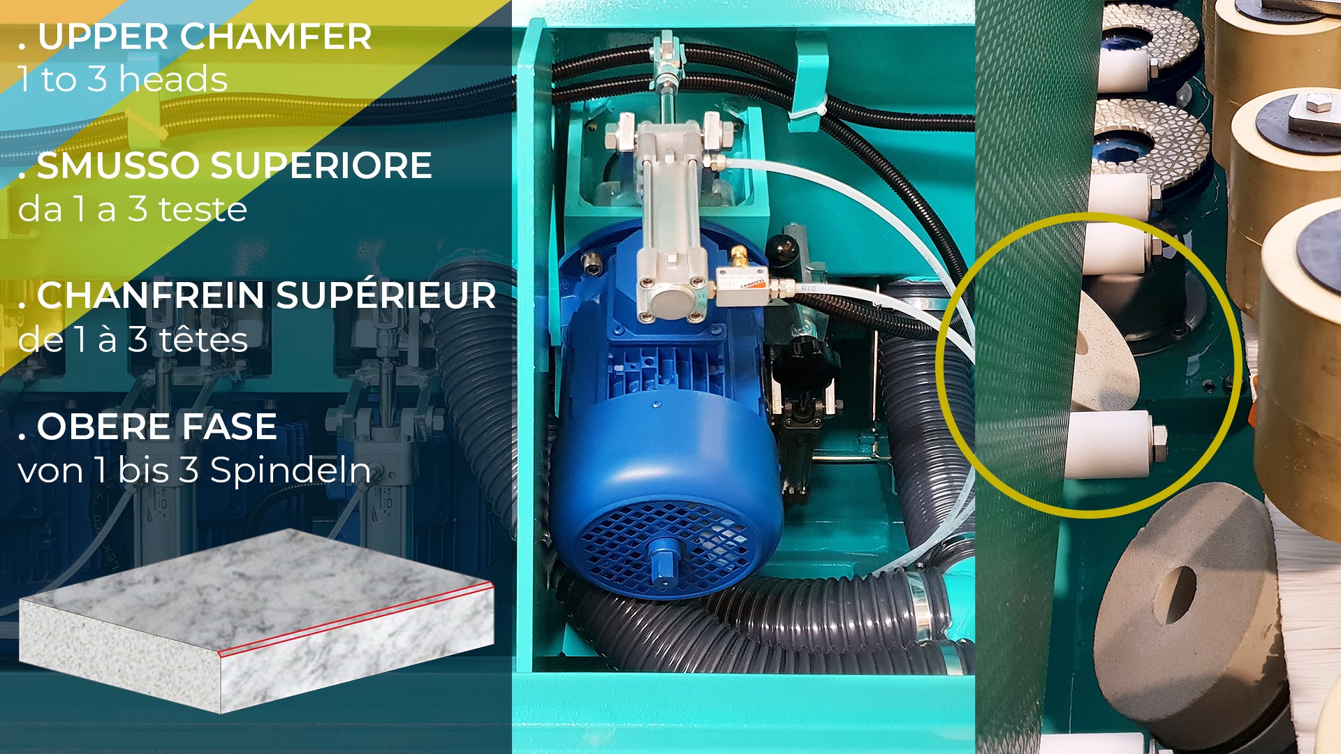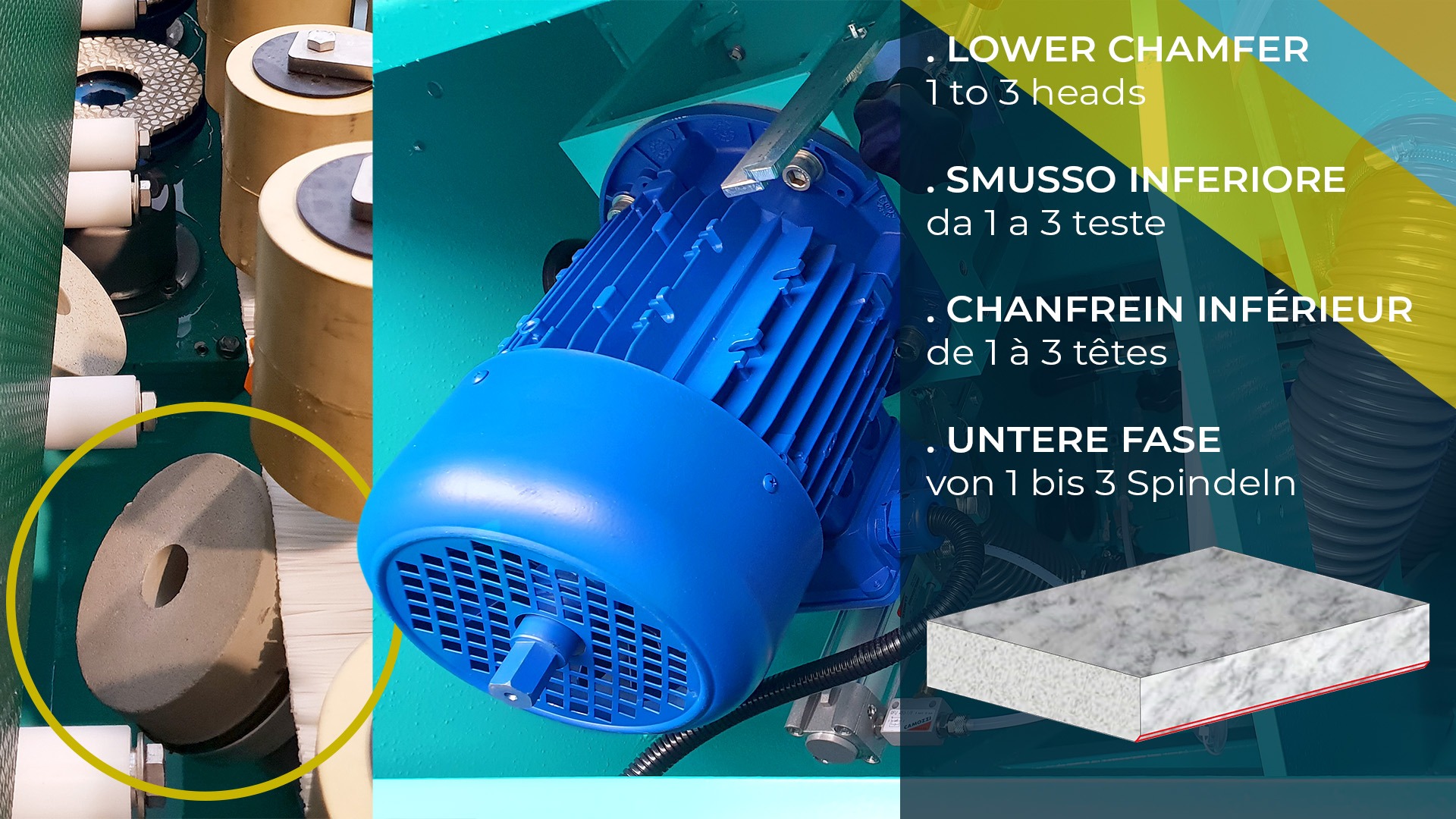 Eficiente, fiable y extremadamente fácil de usar, instalar y mantener, es la solución ideal para el pulido y biselado de cantos planos de 10 a 60 mm en: